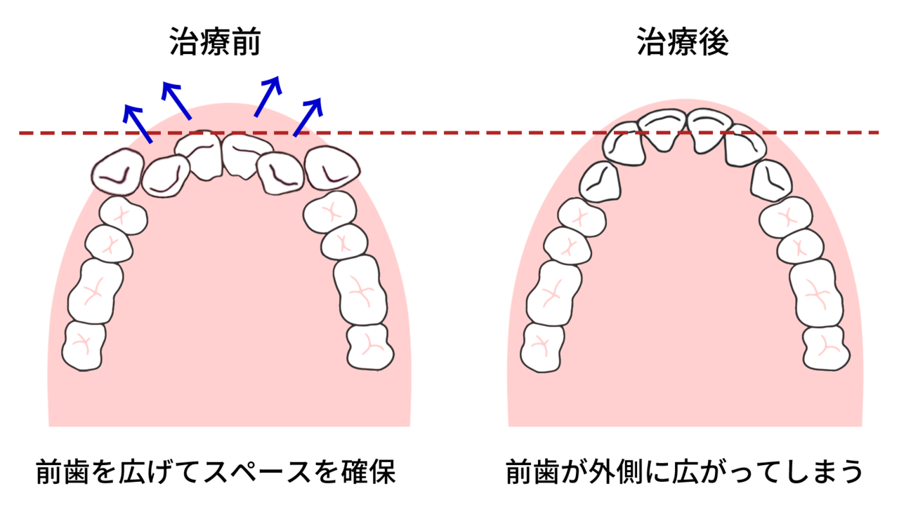 これにより前歯をきれいに並べるスペースを確保し、かつ治療後のガタガタの再発を防止します。
